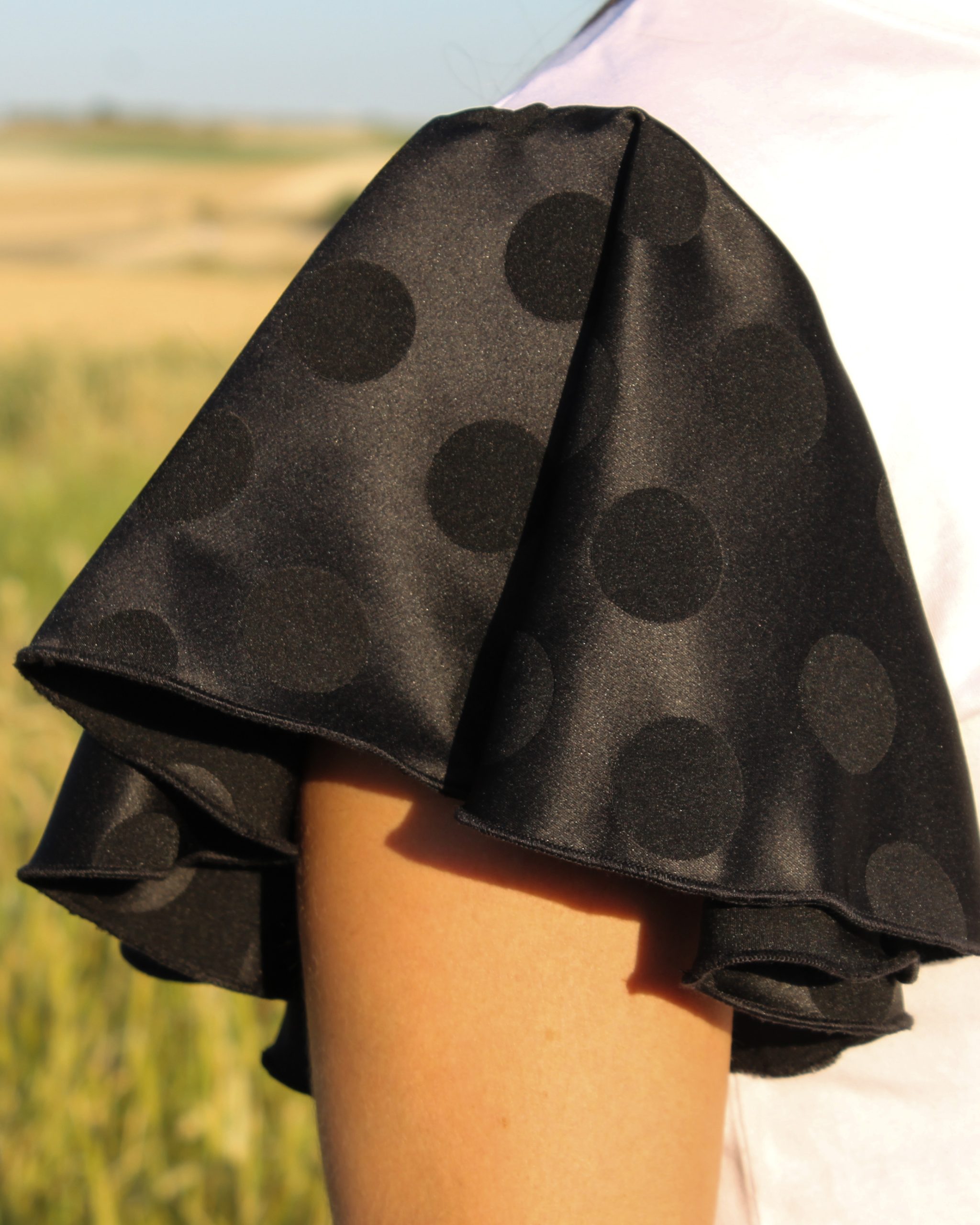 Camiseta 100% algodón con cuello a la Caja, con mangas personalizadas de Satén con topos en Mate Red, Green y Black tipo Volante. A elegir personalización opcional.