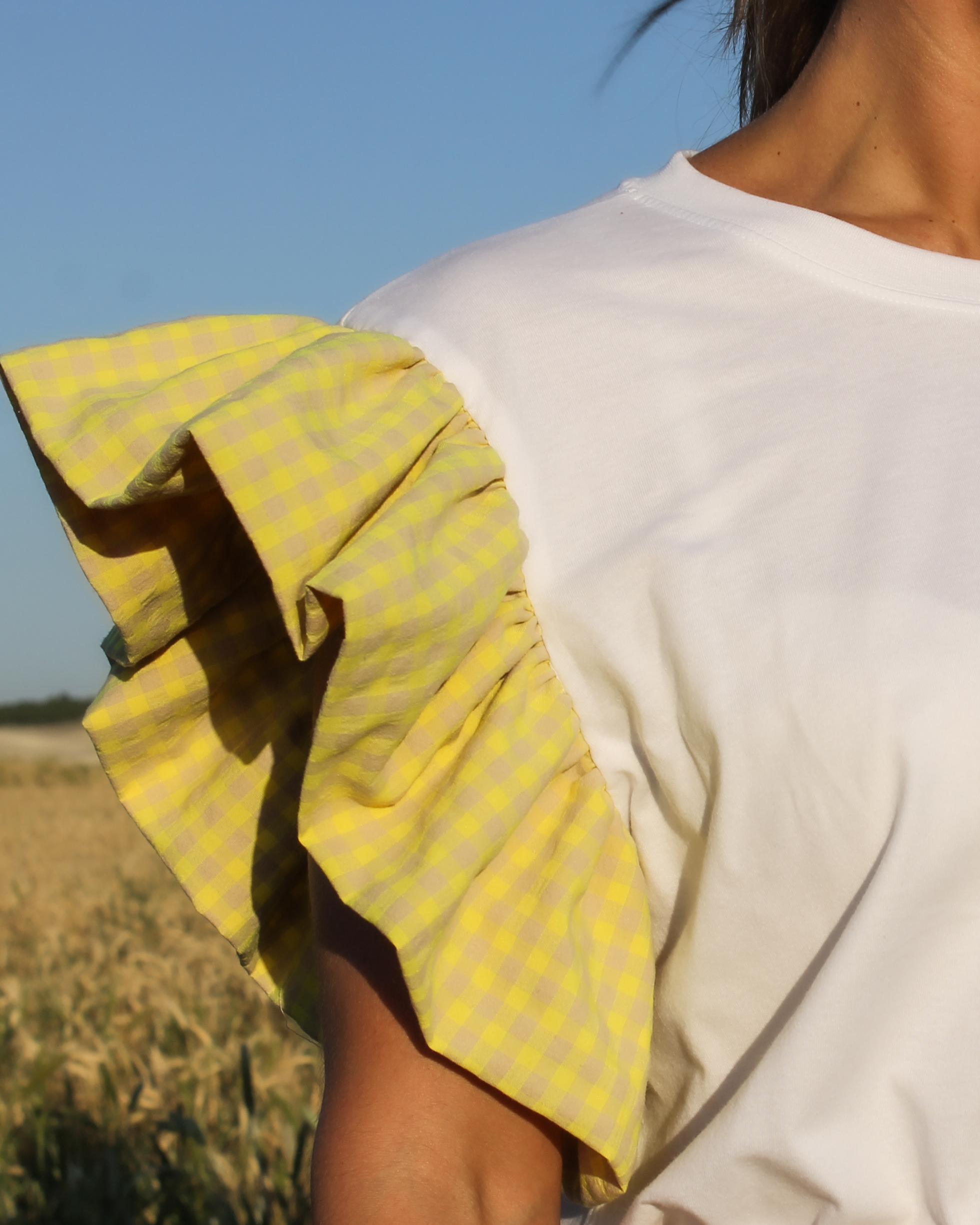 Camiseta 100% algodón de cuello a la Caja, con mangas personalizadas con Volumen disponibles en Vichy Black&White, Beige&Yellow y Naranja Fluor y Rallas Pink, Beige y Blue. A elegir personalización opcional.