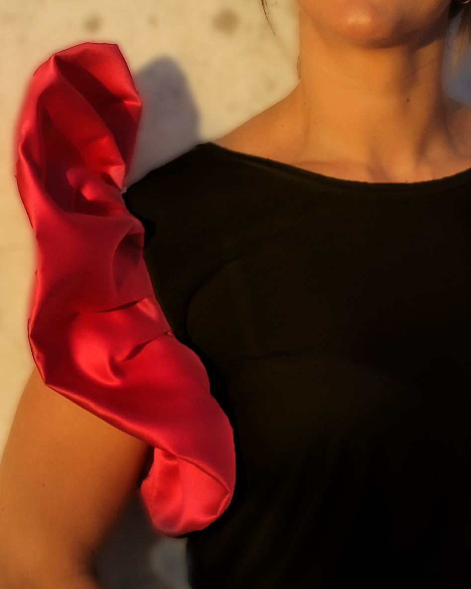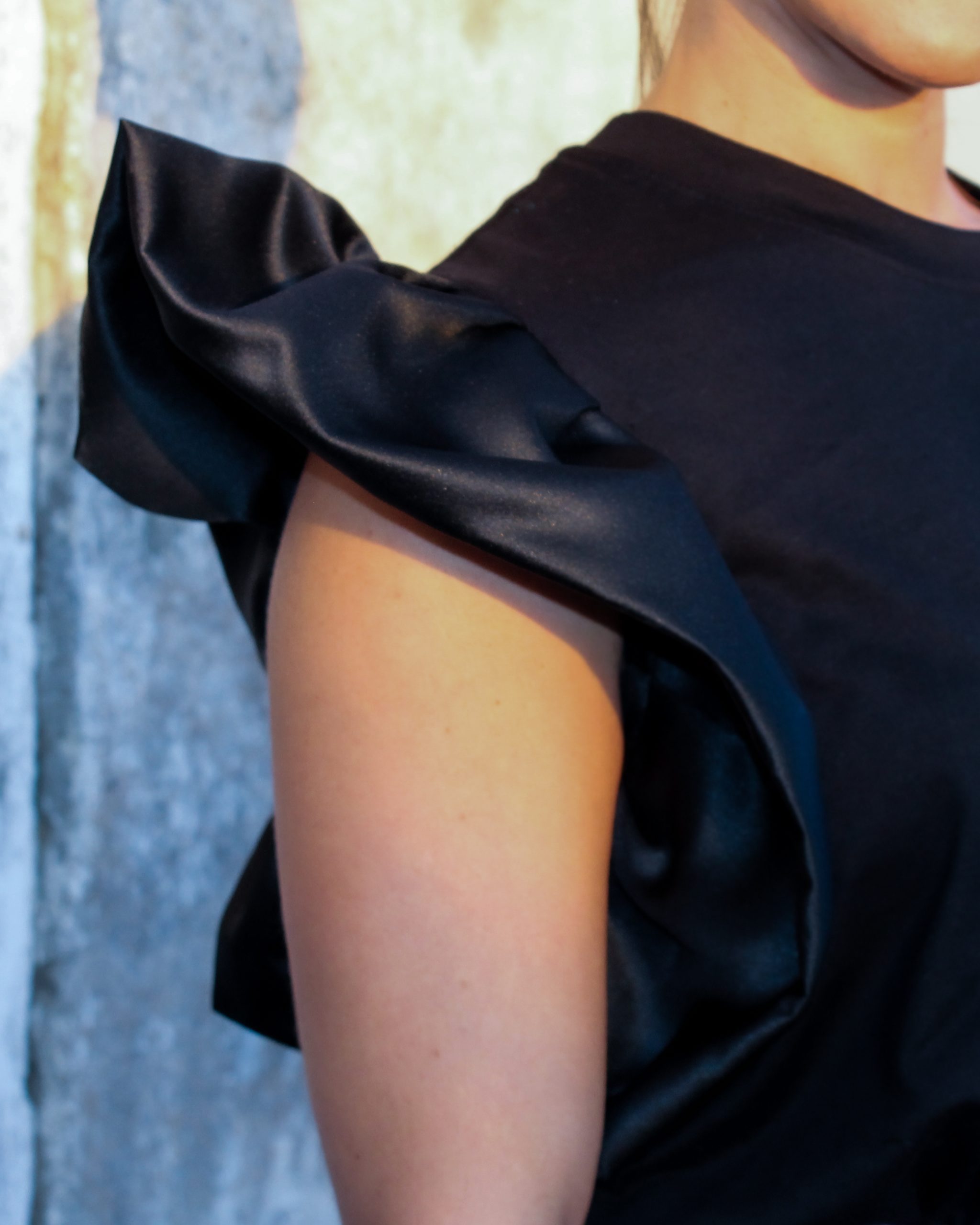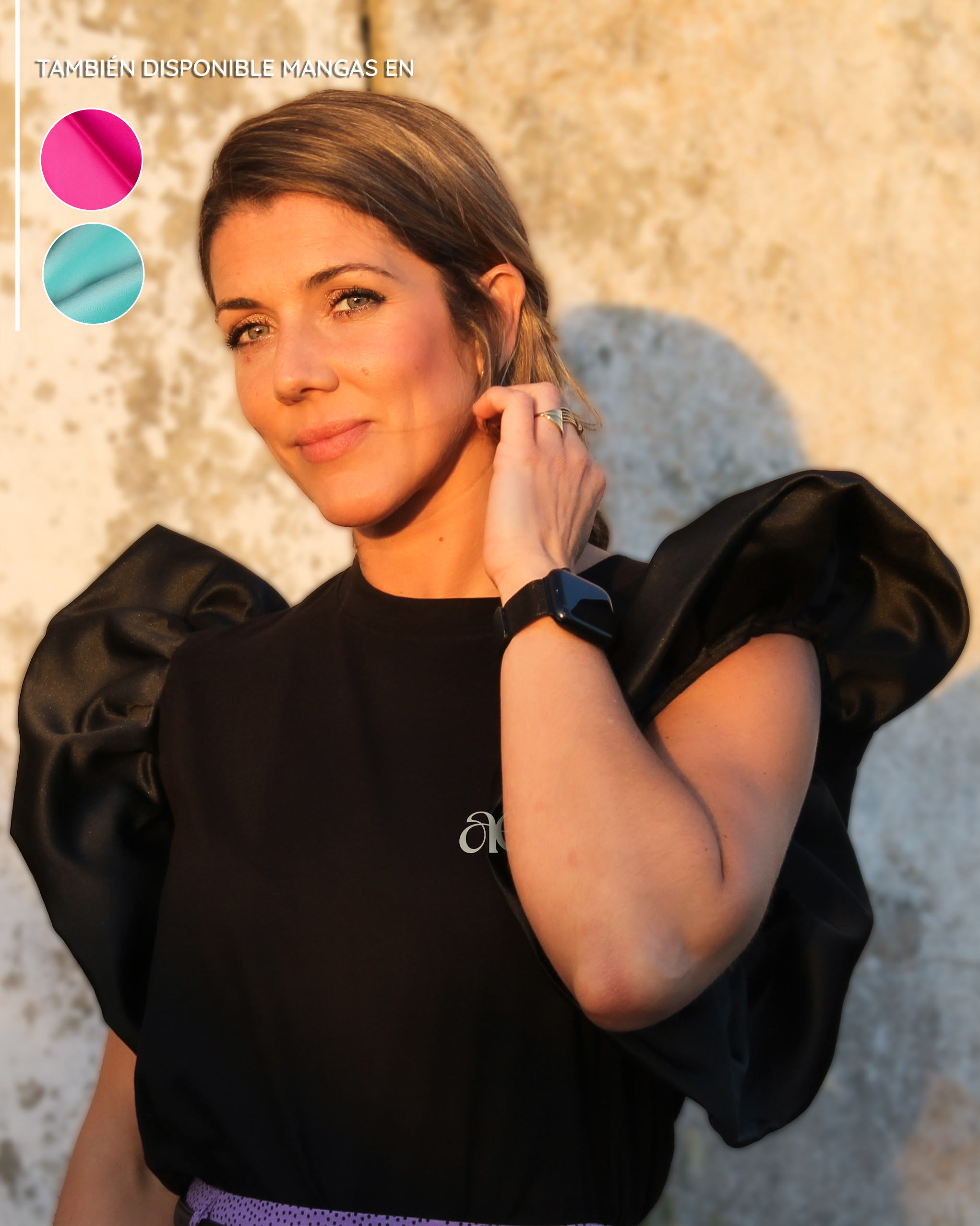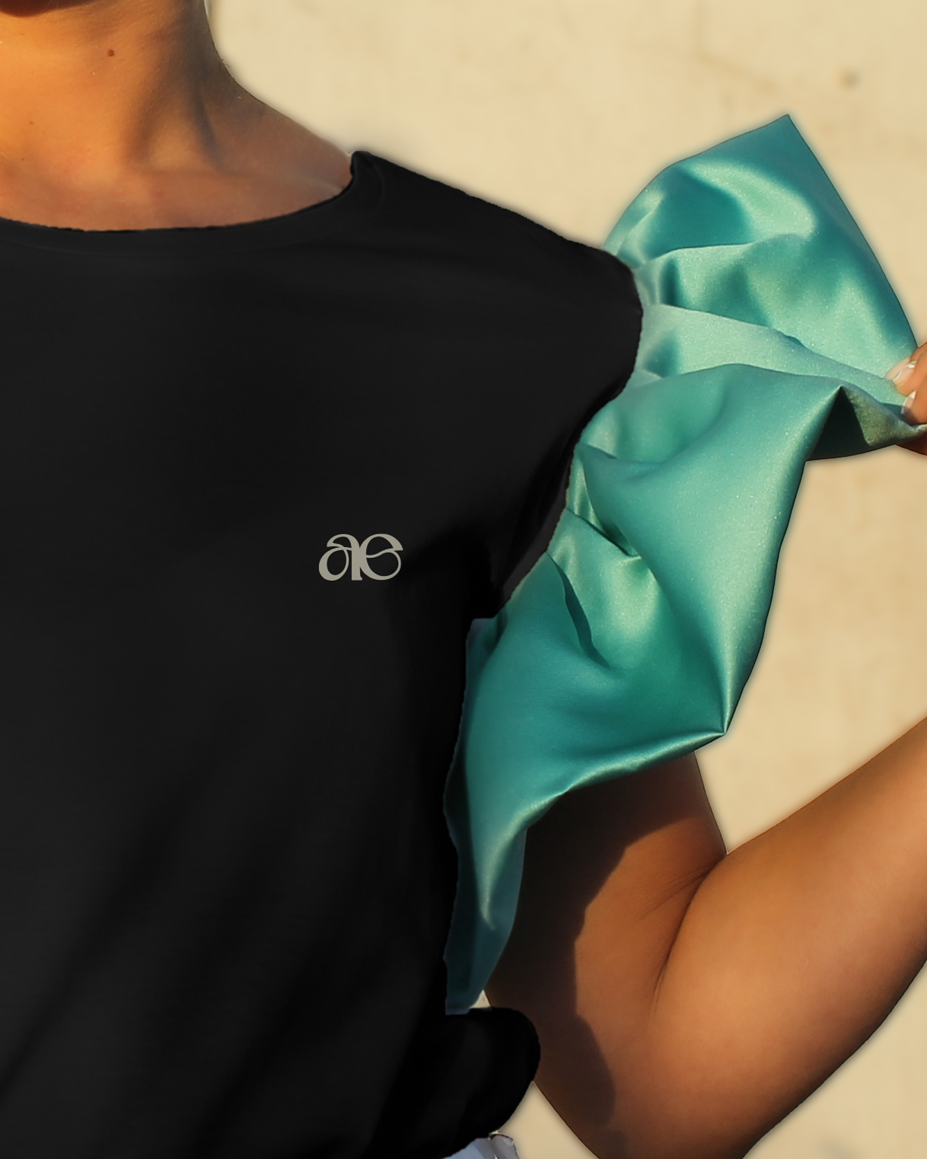 Camiseta 100% algodón con cuello a la Caja, con mangas personalizadas de Raso con Volumen en Menta, Black y Fuscia. A elegir personalización opcional.