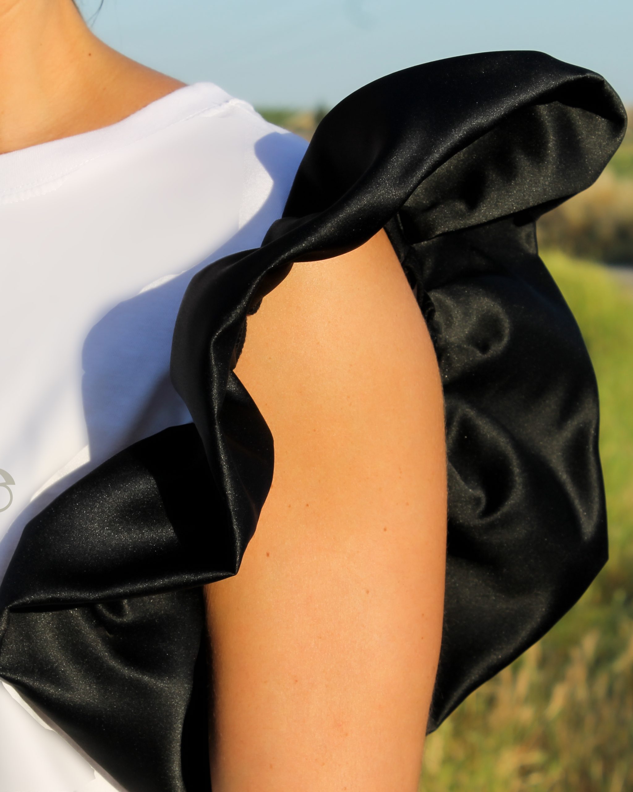 Camiseta 100% algodón con cuello a la Caja, con mangas personalizadas de Raso con Volumen en Menta, Black y Fuscia. A elegir personalización opcional.